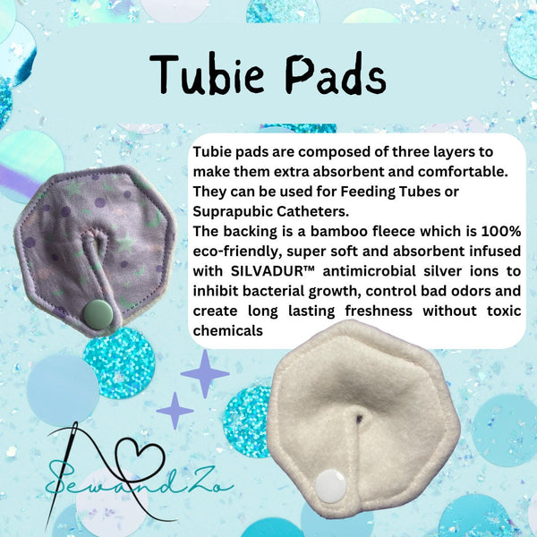 Each tubie pads has 3 layers of fabric. All pads are backed with Silvadur Bamboo Fleece. Bamboo Fleece is 100% eco-friendly. It is infused with Silvadur™ anti-microbial silver ions to inhibit bacterial growth, control bad odours and create long lasting freshness without toxic chemicals. Bamboo fleece is extremely water absorbent and can hold up to three times its weight, which makes it an excellent moisture wicking fabric, which is perfect for stoma sites.